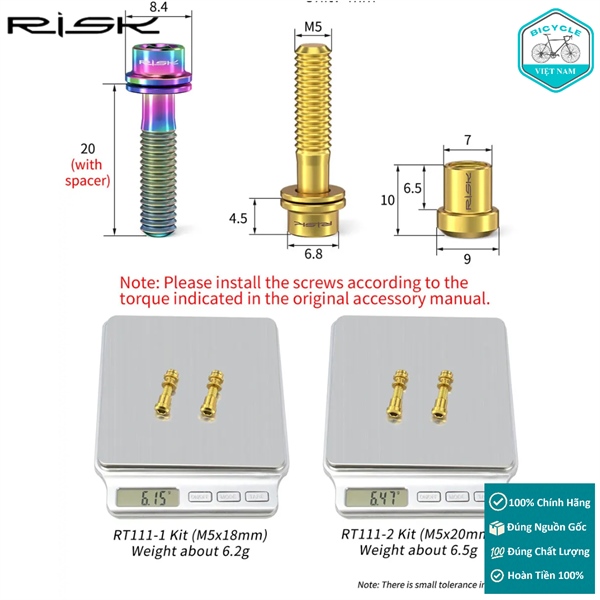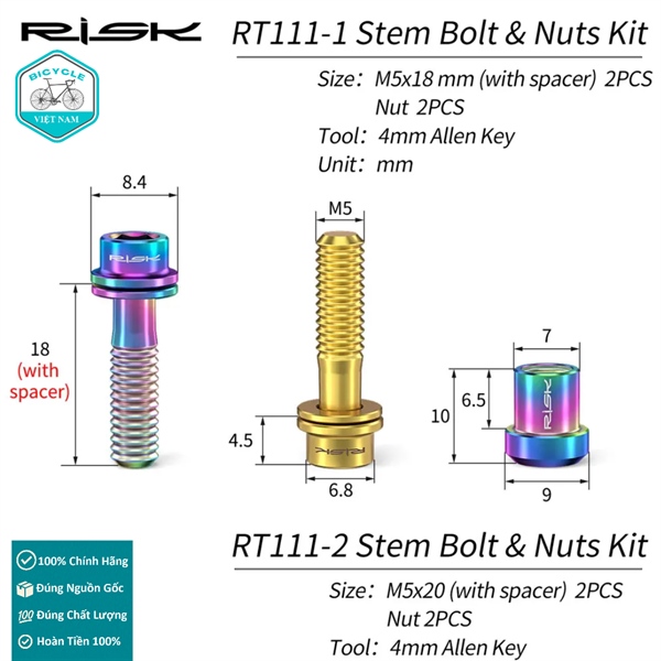 Bộ 2 Ốc Vít Titanium Cho Pô Tăng Xe Đạp RISK M5x18mm – Siêu Nhẹ, Chống Gỉ