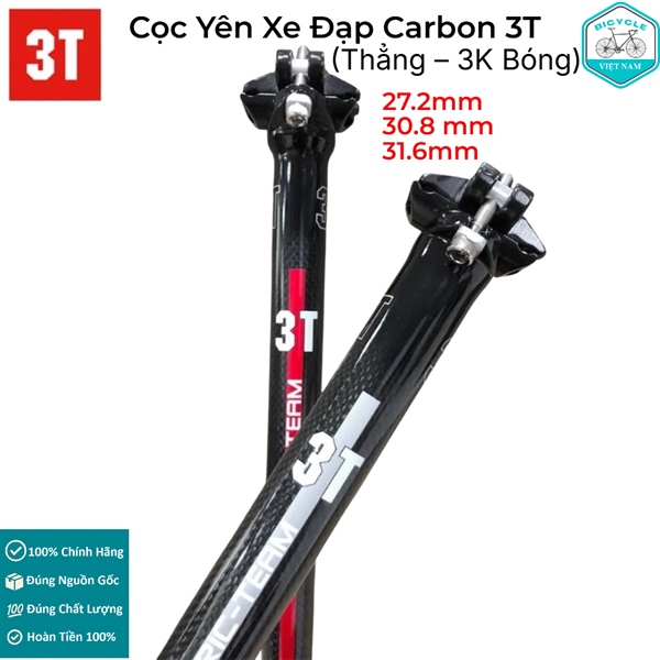 Cọc Yên Xe Đạp Carbon 3T 27.2 / 30.8 / 31.6mm (Thẳng – 3K Bóng) – Siêu Nhẹ, Cao Cấp