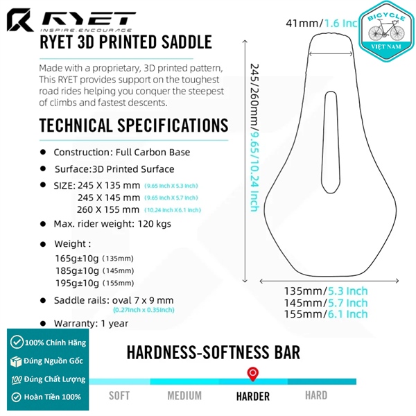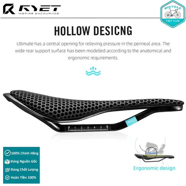 Yên Xe Đạp Thể Thao In 3D RYET – Gọng Carbon T1000 – Êm & Thoáng – 135mm / 145mm / 155mm
